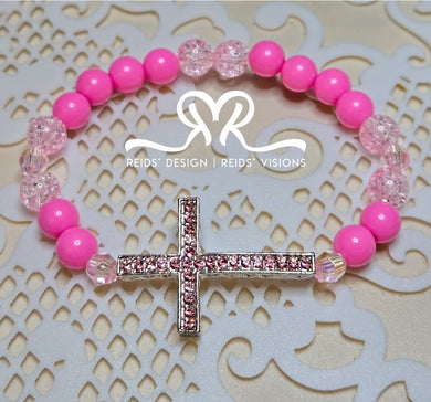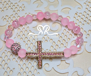 • "IRIS" Cross Bracelets with 8mm Pink Frosted Glass Beads and Gem ( size 7.5")