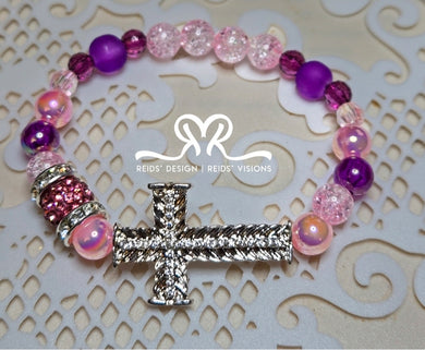 • "IRIS" Cross Bracelets with 8mm Pink and Purple mix Glass Beads ( size 7.5")
