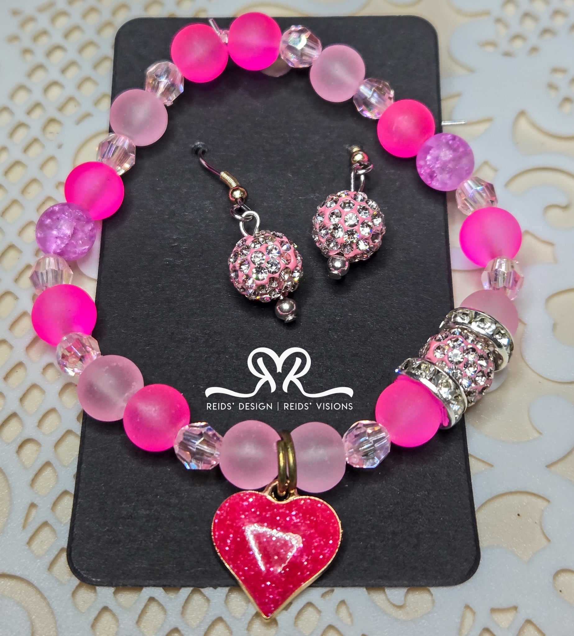 ❤️" Pink blend Rhinestone Crystal 10mm and Glass 8mm Beaded Bracelet with Stainless Steel Heart Earrings set ( size 7.5")