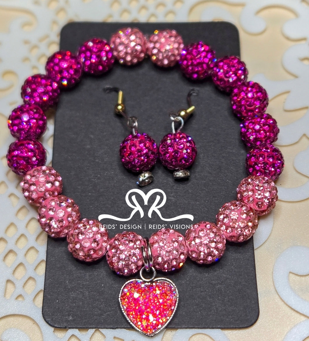 "❤️" Pink blend Rhinestone Crystal 10mm Beaded Bracelet with Stainless Steel Heart and earrings set ( size 7.5")